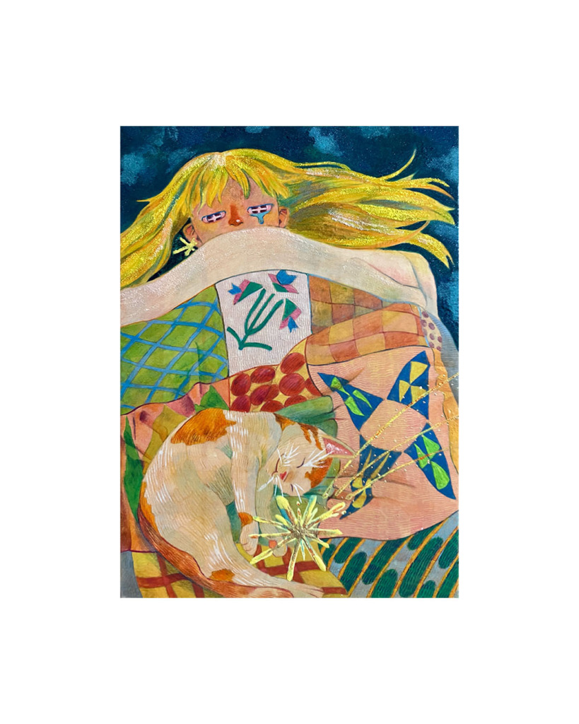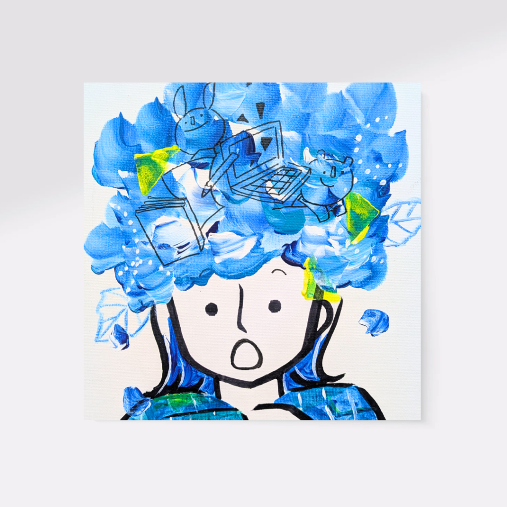 2020年頃、美術館で見た日本画をきっかけに多様な画材に興味を持ち、油彩・アクリル・水彩・ペンなど様々な技法を用いて制作。