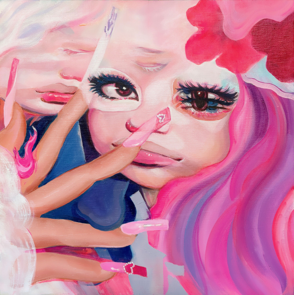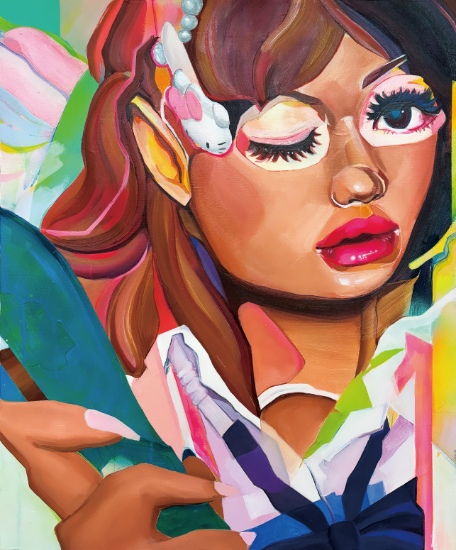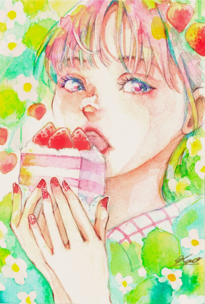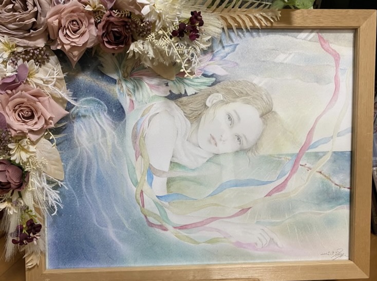 油絵で培った基礎力と色彩感覚に、少女漫画テイストを融合させた、可憐で繊細な平面作品を得意とする。