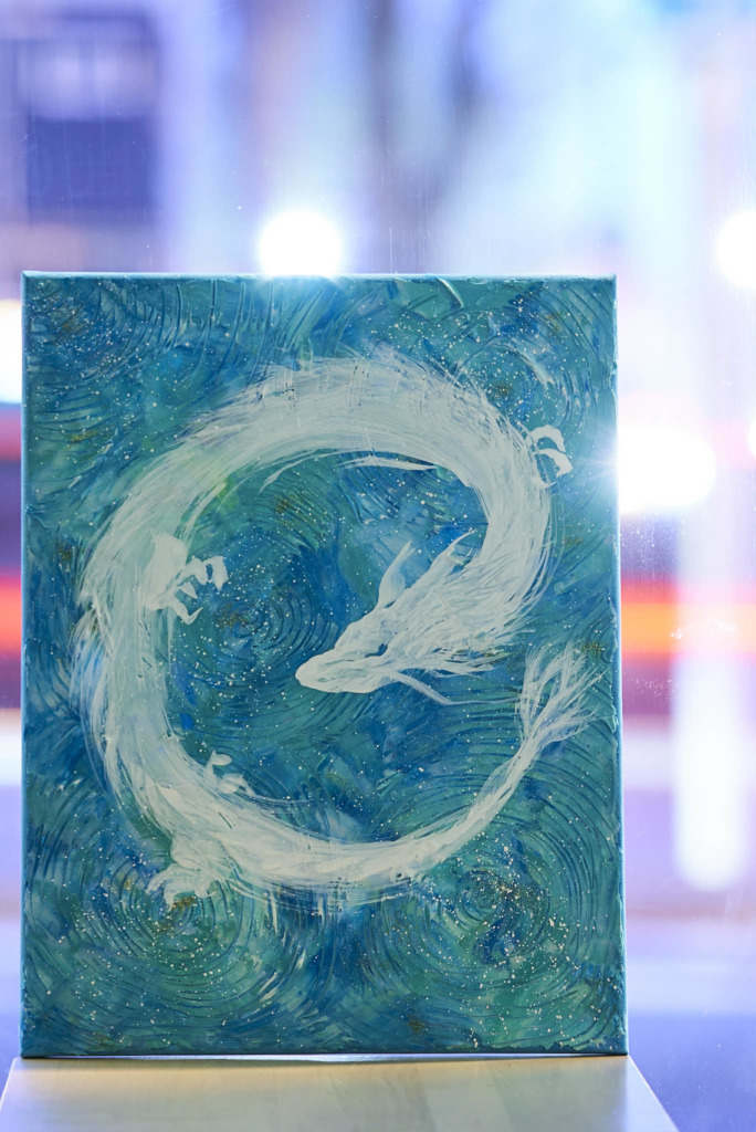 龍は、内なる光を呼び覚ます象徴。静かな祈りを込めながら制作を続ける一方、音楽活動も行い、表現の領域を横断している。