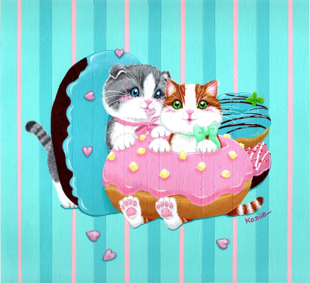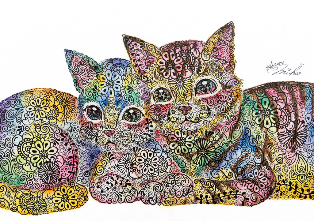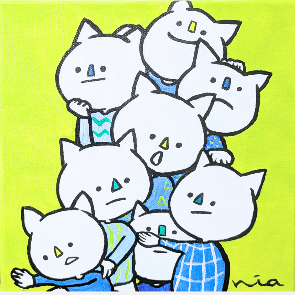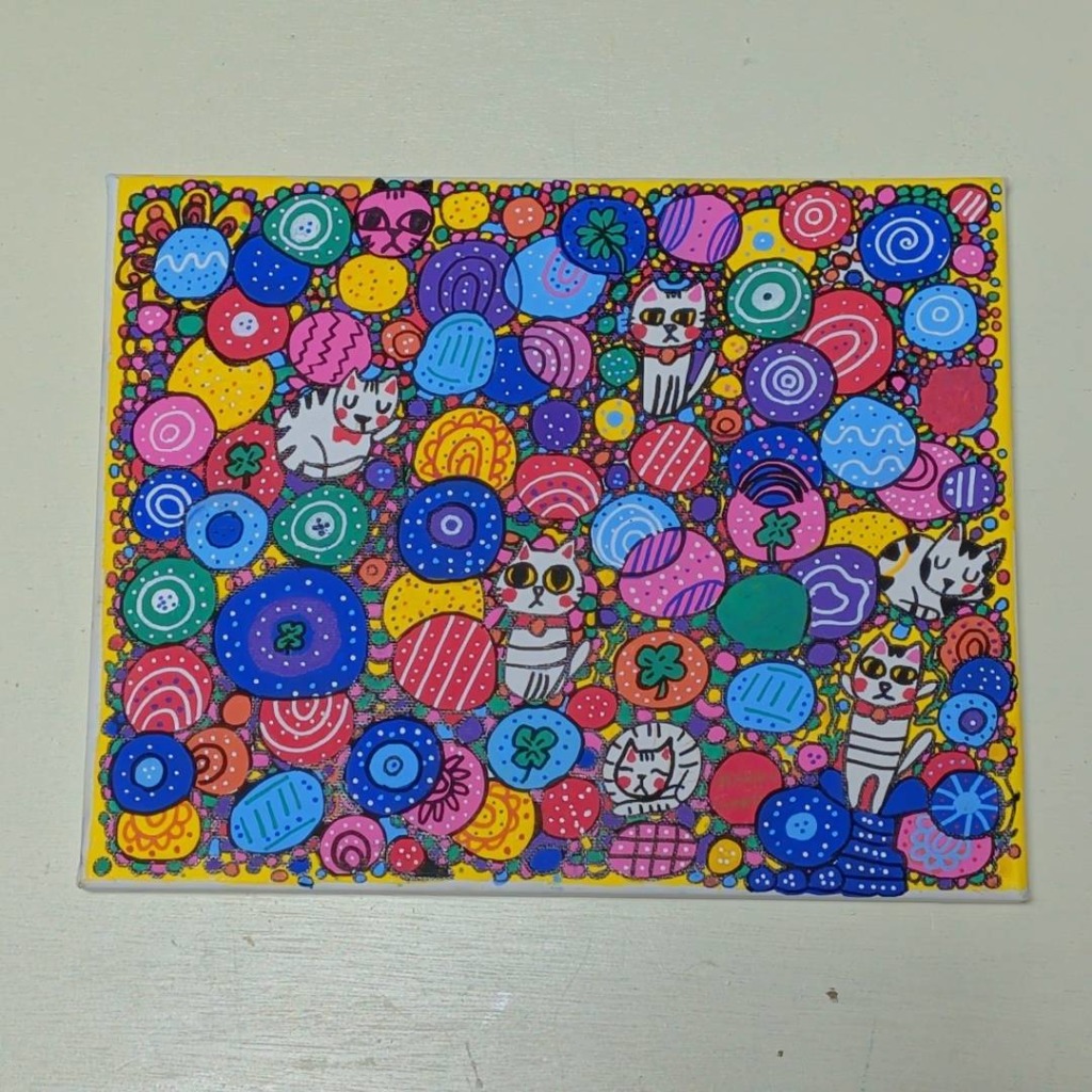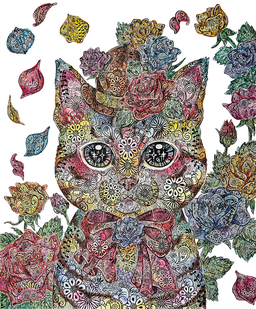 「幸せと祈り」をテーマに、自由な線や形から作品を生み出し、その中に偶然現れる“猫”を探し出してカラフルに彩る独自のスタイルで制作している。